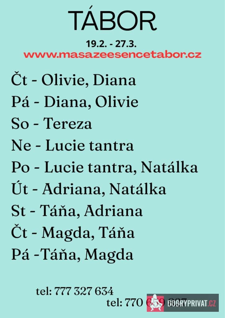 Vítám vás v salonu MASÁŽE ESENCE, www.masazeesencetabor.cz. JSEM TU PRO TEBE Jen v sobotu 21.3. Jsem smyslná dívka co vás ráda potěší. Extra: masáž prostaty, footjob, BDSM soft a další. Pro více informací volejte: 777327634 nebo 770659827. JEDNÁ SE O EROTICKOU MASÁŽ. Je to velice hravá a intimní masáž, do které zapojím nejen své ruce, ale i stehna, zadeček i prsa. DOPORUČUJI: délku masáže 60 min. a z důvodu hlubšího prožitku délku 90 min. www.masazeesencetabor.cz